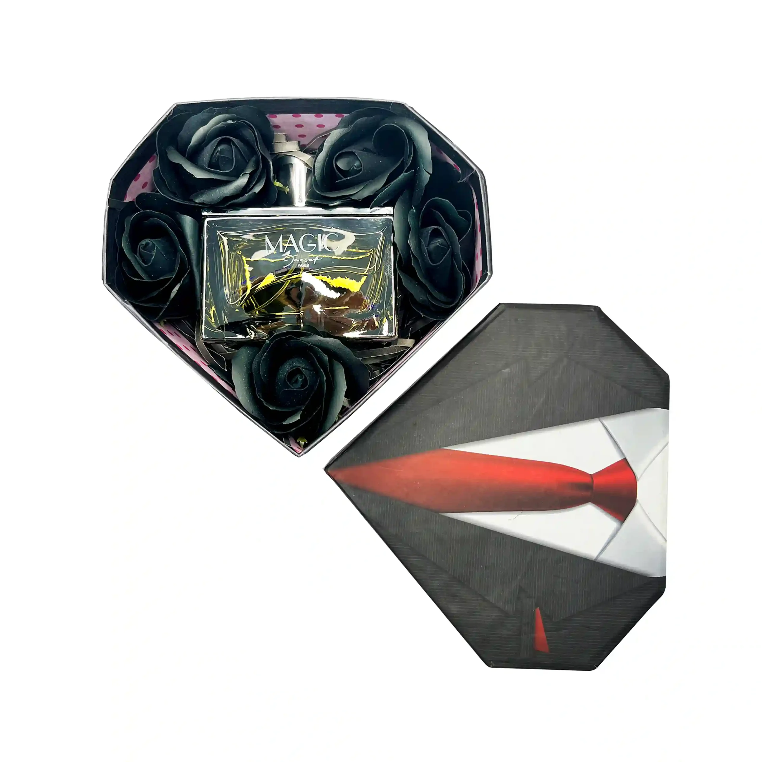 باکس هدیه لاکچری شامل ادکلن و گل رز در باکس شیک با پوشال، انتخابی کاربردی و متفاوت برای ولنتاین، تولد و مناسبتهای خاص