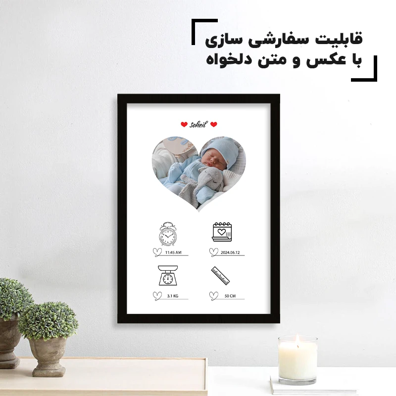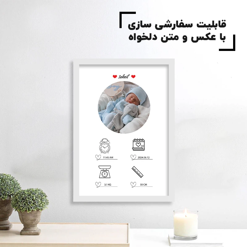 یکی از مهمترین ویژگیهای تابلو سفارشی نوزاد، قابلیت شخصیسازی کامل آن است. شما میتوانید عکس دلخواه، متن اختصاصی و اطلاعات موردنظر خود را انتخاب کنید تا محصولی کاملاً منحصربهفرد داشته باشید. همین موضوع باعث میشود این تابلو، گزینهای عالی برای هدیه تولد نوزاد، سیسمونی، یا یادگاری ارزشمند برای والدین باشد.