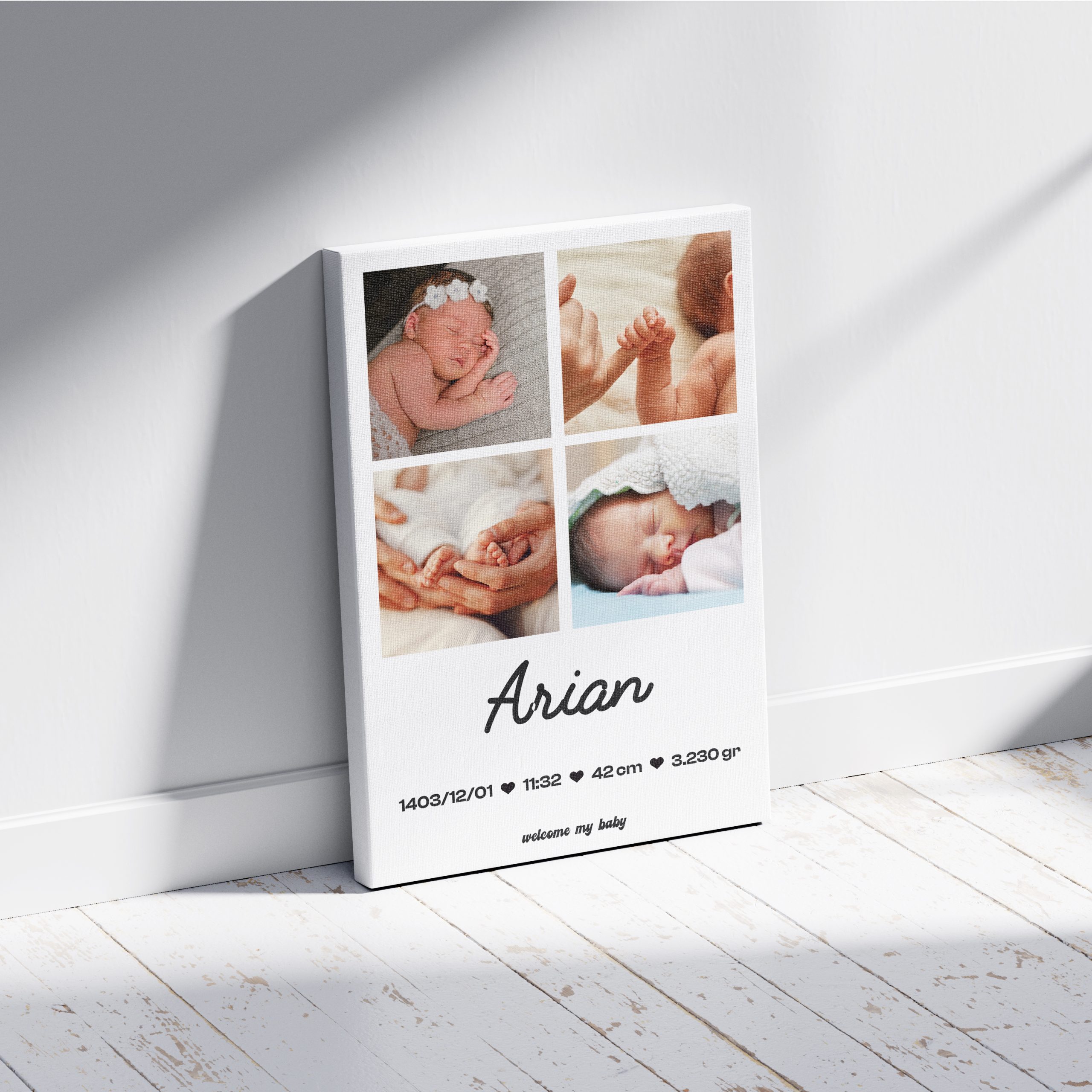 تابلو سفارشی نوزاد یک انتخاب خاص و احساسی برای ثبت شیرین‌ترین لحظات تولد فرشته کوچولوی شماست. این تابلو موزیکال نوزاد با طراحی اختصاصی بر اساس اطلاعات نوزاد (مانند نام، تاریخ تولد، ساعت و وزن تولد و …) ساخته می‌شود و می‌تواند به‌همراه عکس دلخواه و حتی آهنگ منتخب شما با QR کد اختصاصی شخصی‌سازی شود.