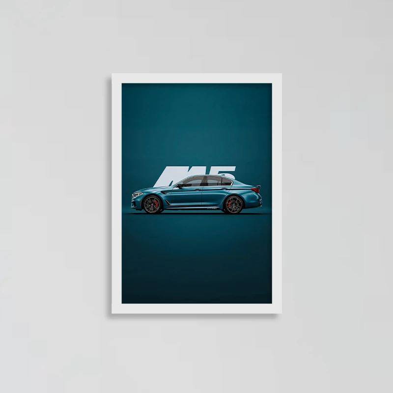 در طراحی این تابلو، فرم جانبی خودرو با دقت و ظرافت به تصویر کشیده شده است. خطوط تیز بدنه، تناسبات عضلانی و جزئیات اسپرت، بهخوبی هویت قدرتمند M5 را منعکس میکنند. پسزمینه ساده و رنگبندی هماهنگ، باعث شده تمرکز اصلی روی خود خودرو باقی بماند و جلوهای مدرن و حرفهای ایجاد شود. استفاده از المان تایپوگرافی «M5» نیز به تقویت هویت بصری تابلو کمک کرده است.