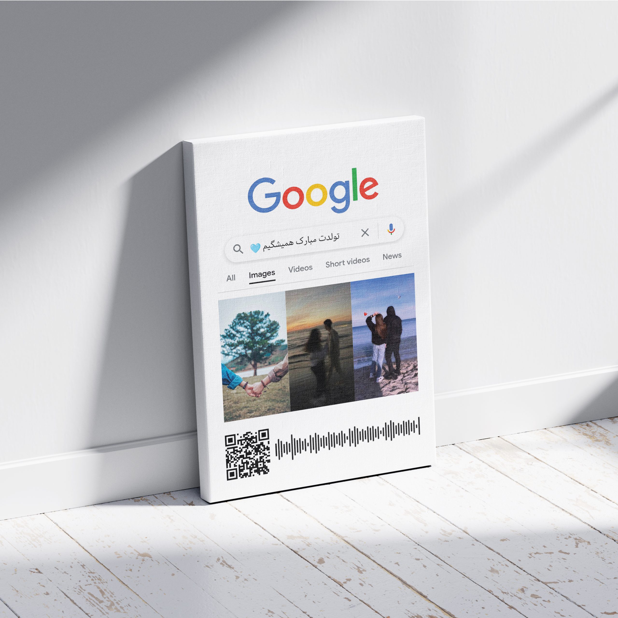 این تابلو صوتی یا موزیکال طرح گوگل google سفارشی الهام‌گرفته از همون لحظه‌ست که یکی توی گوگل می‌نویسه: “دوستت دارم” و اولین چیزی که میاد، یه تصویر عاشقانه‌ست. مثل همین قاب تابلو. با طراحی شبیه به محیط جستجوی گوگل و یه QR کد موزیک خاص، این تابلو یه اعتراف عاشقانه‌ست که هم خلاقه، هم بامزه و هم از ته دل! وقتی عشق رو توی گوگل می‌زنی، این میاد.