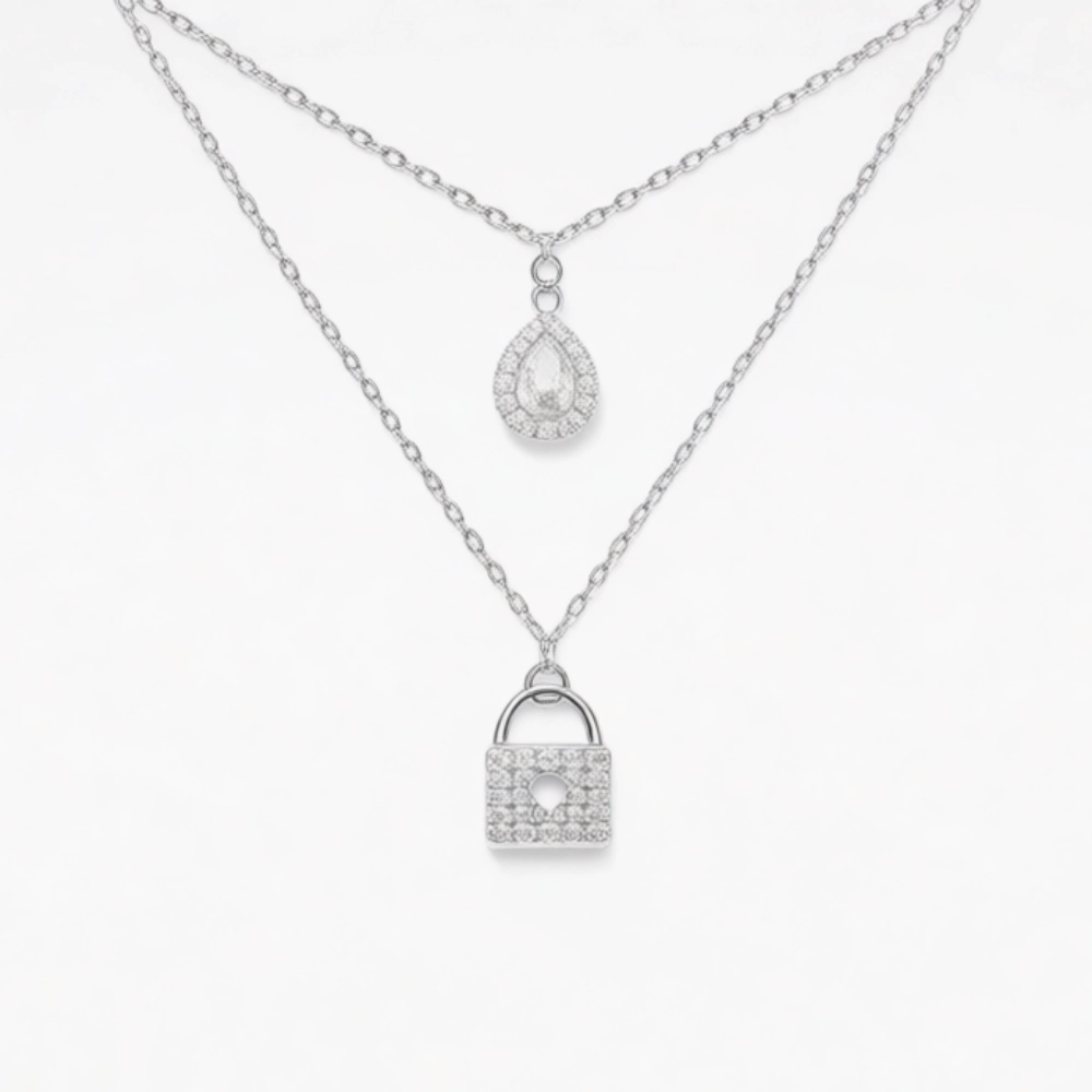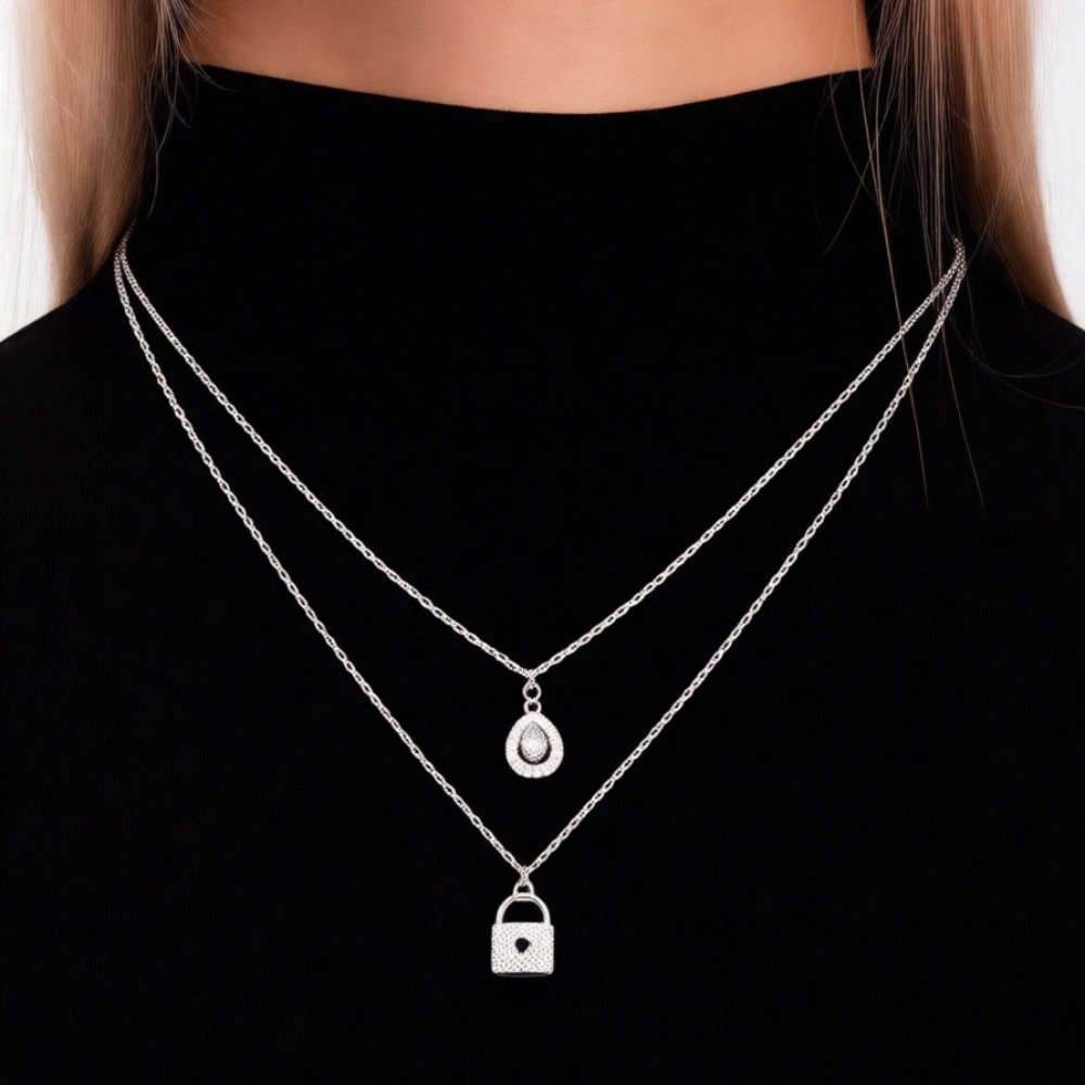 گردنبند نقره دخترانه 925 اصل مدل قفل و نگین دو رج، ترکیبی چشم‌نواز از طراحی ظریف و مدرن است که با الهام از نماد قفل و نگین اشکی، جلوه‌ای خاص و متفاوت به استایل شما می‌بخشد. این گردنبند نقره زنانه با دو زنجیر مجزا، جلوه لایه‌ای (Layered) بسیار ترندی ایجاد می‌کند و انتخابی عالی برای استفاده روزمره و همچنین استایل‌های مجلسی به شمار می‌رود. استفاده از نقره استرلینگ 925 اصل و نگین‌های درخشان، این محصول را به گزینه‌ای ماندگار، شیک و مناسب هدیه برای دختران و خانم‌های خوش‌سلیقه تبدیل کرده است.